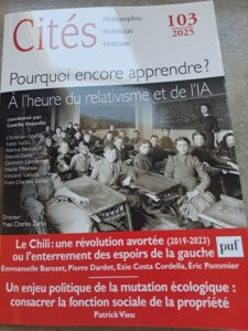 Composition du dossier: Éric Pommier, PrésentationEmmanuelle Barozet, La révolte chilienne de 2019 et le premier référendum constitutionnel de 2022 : regards rétrospectifsPierre Dardot, Un « processus constituant » confisqué par le ParlementEzio Costa Cordella, Un printemps inachevé : le Chili et la questionenvironnementale (2019-2024)Daniel Mansuy, L’énigme Allende, 50 ans après